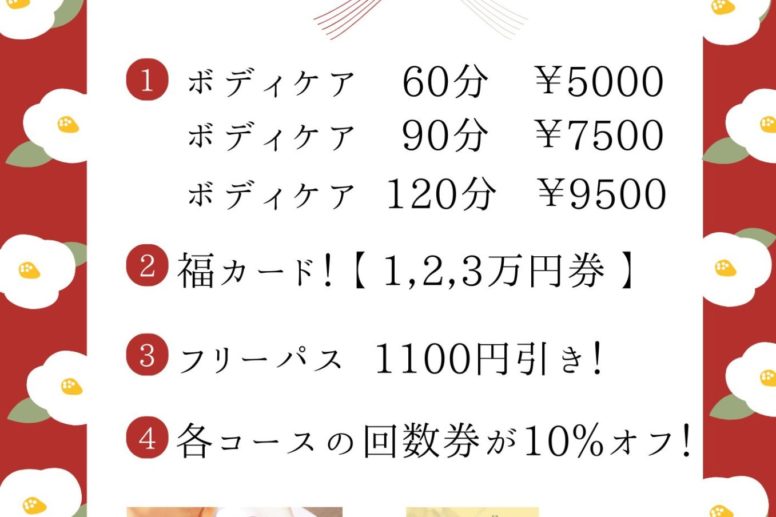 あけましておめでとうございます 1月のキャンペーンも盛りだくさん ボディケア 60分 ¥5000 9 …